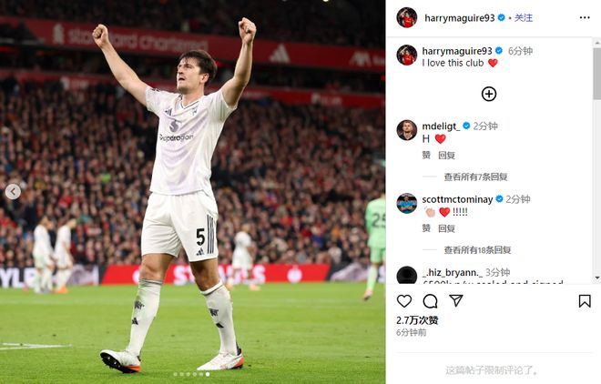 在比赛结束后,马奎尔也激动万分,他在社媒上写道:“I love this club(我爱这个俱乐部)”,并且在社媒,上传了多张自己在进球后庆祝的照片。